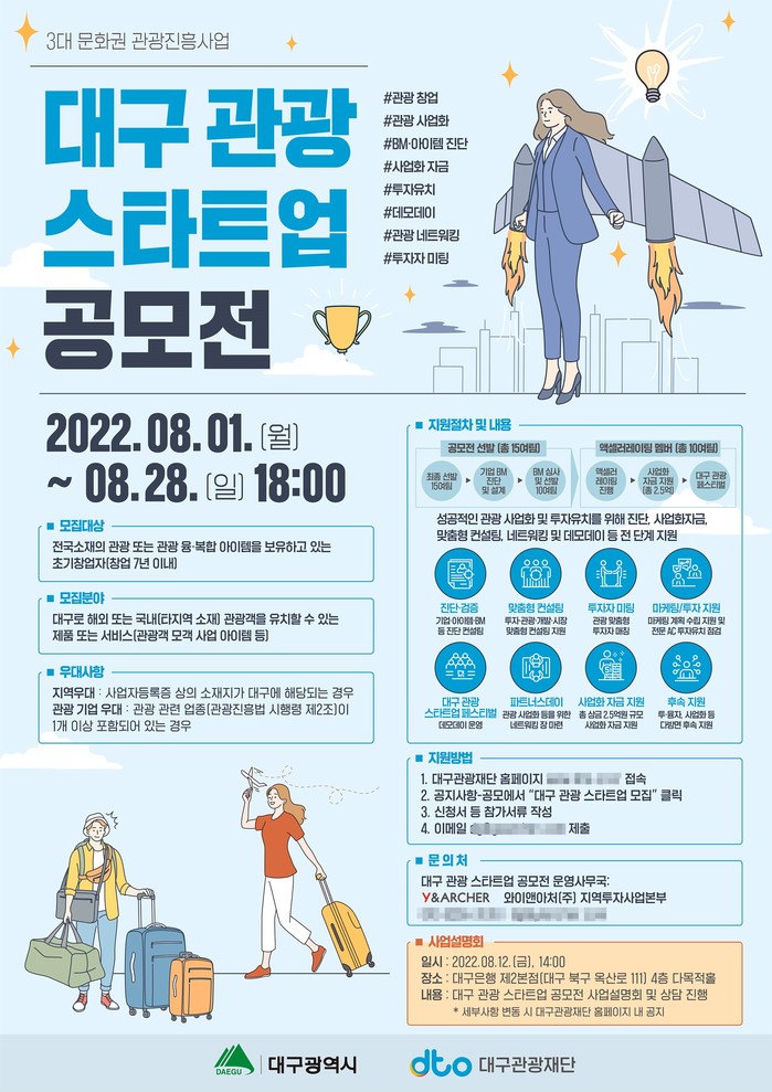 자세한 설명을 위한 ‘대구 관광 스타트업 사업 설명회’는 12일 대구은행 제2본점에서 진행될 예정으로 참가기업 모집 공모 소개, 방향성 등 다양한 질의응답 및 관련 상담도 할 수 있는 좋은 기회를 제공한다.