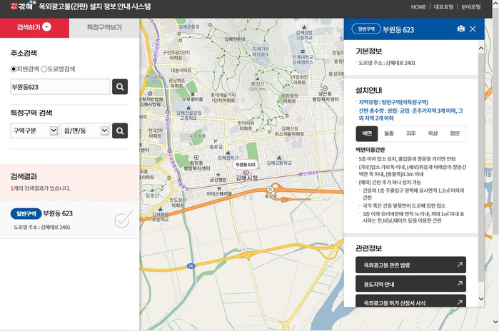 서비스를 이용하려면 ‘김해시청 누리집 > 자주찾는 서비스 > 광고물 연장신청·설치정보 배너’로 이동해 주소를 검색하면 옥외광고물 설치기준과 특정구역 지정 현황 정보를 확인할 수 있다.