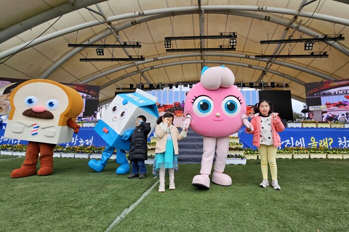 | ▲ 강진청자축제장에서 선보인 어린이 뮤지컬 공연 관람에 나선 어린이들과 브레드 이발소 캐릭터 기념촬영 / 강진군 제공 |