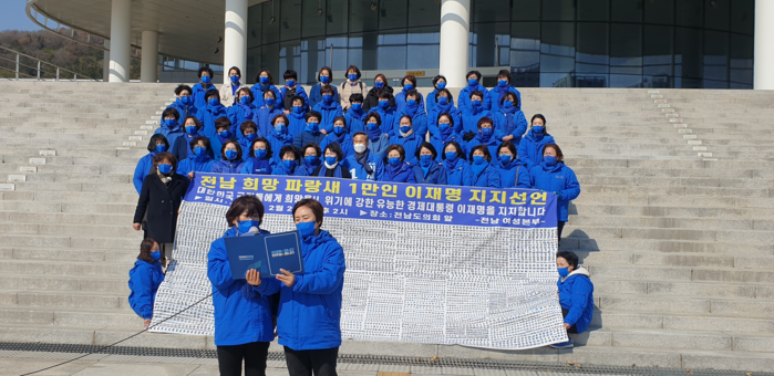 전남도민 1만인들을 대표하여 성명서를 낭독한 노영미 공동본부장(전남영암군 의원)과 박은서 담양지역여성위원장은 “새로운 남부권 시대를 열어가기 위해 혁신적인 새 희망으로 전남에 미래를 심겠다는 약속을 한 이재명 후보는, 전남의 미래를 책임지고 더 나아가 대한민국 대전환의 희망 파랑새이다”라고 전했다.