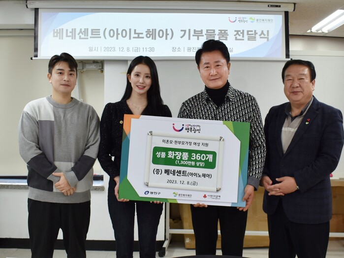 [시민일보 = 이창훈 기자] 베네센트는 연말을 맞이해 비건 스킨케어 브랜드 아이노헤아(AINOHEA)의 1300만원 상당의 제품을 광진복지재단에 기부했다고 15일 밝혔다.