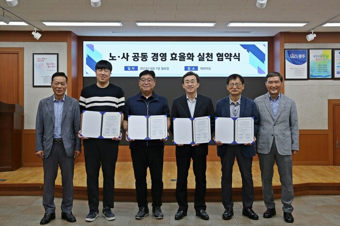 | ▲ 김성환 광주환경공단 이사장(오른 쪽부터 3번)이 7일 공단 대회의실에서 노사 공동 경영 효율화 실천 협약을 체결하고 관계자들과 기념촬영을 하고 있다. / 광주환경공단 제공 |