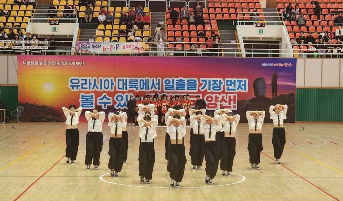 이날 체조 부문에는 합천군 대표로 합천읍주민자치위원회 문화여가 프로그램 줌바 수강생 등 17명이 참여해 2곡에 맞춰 4분간 경연을 펼쳤다. 지팡이 등 소품도 활용하며 화려한 무대를 만들었다.
