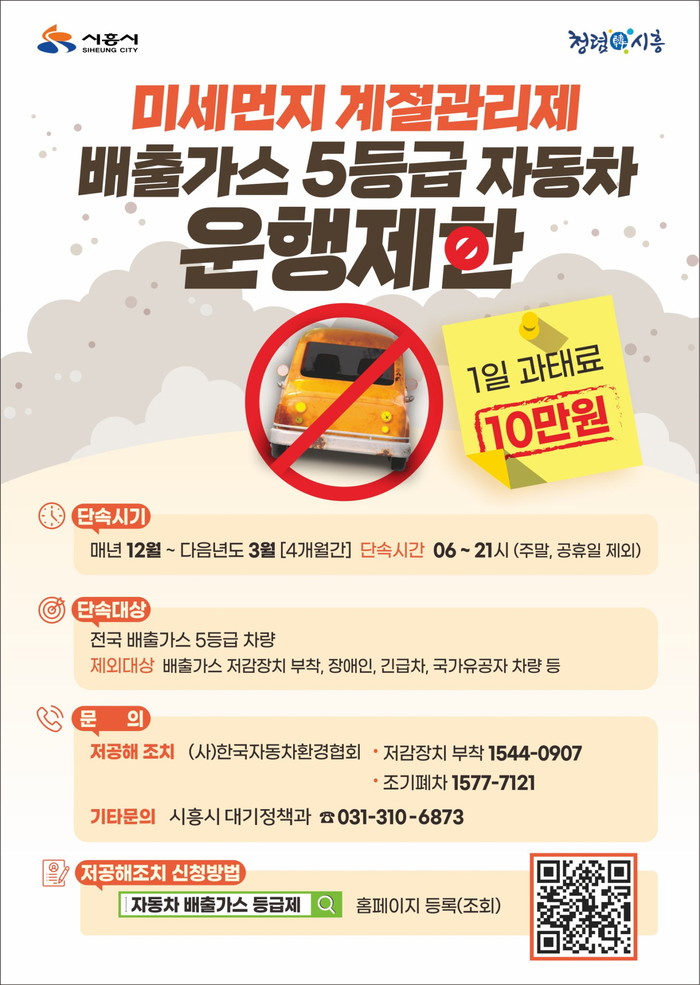 12월에서 3월까지 계절관리제 기간 동안 전국의 배출가스 5등급 차량에는 운행 시 1일 1회 10만 원의 과태료가 부과된다.