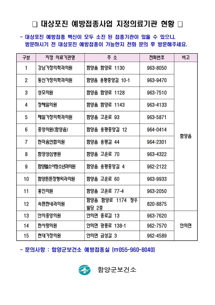 대상포진 예방접종 대상자는 1년 이상 함양군에 주민등록을 두고 있는 65세 이상 어르신이며 과거에 대상포진 예방접종 이력이 있거나 면역저하자 등 대상포진 접종 금기증이 있는 분들은 접종 대상에서 제외되며, 또한 대상포진을 이미 앓은 경우에는 회복 6~12개월 이후에 접종을 받을 수 있다.