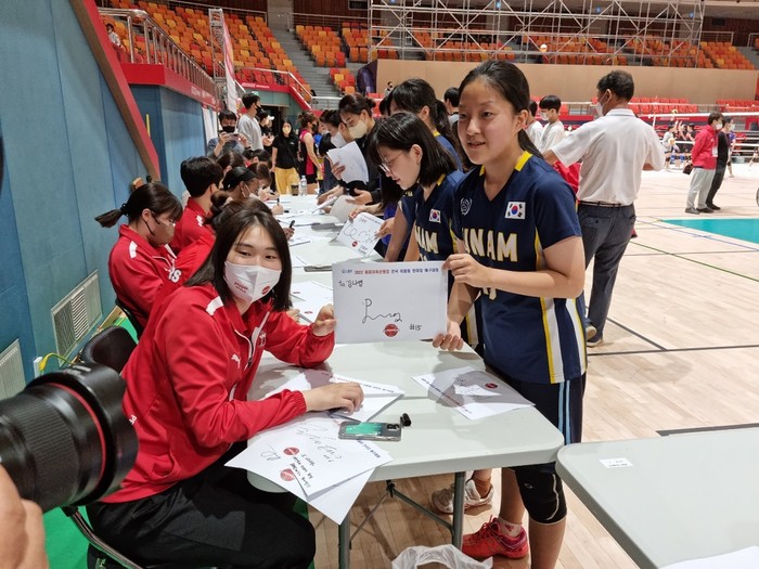 | ▲ AI페퍼스 배구선수들이 2022 페퍼저축은행컵 경기 참가자들에게 사인행사를 하며 기념촬영을 있다. / 광주광역시 제공 |