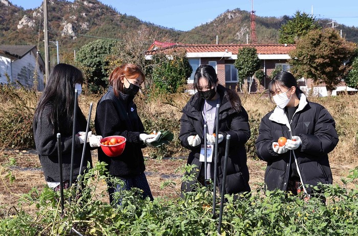| ▲ 학생들의 수학여행지로 부각되고 있는 강진군 푸소체험 현장에서 학생들이 농작물을 수확하고 있다. / 자료사진 = 강진군 제공 |