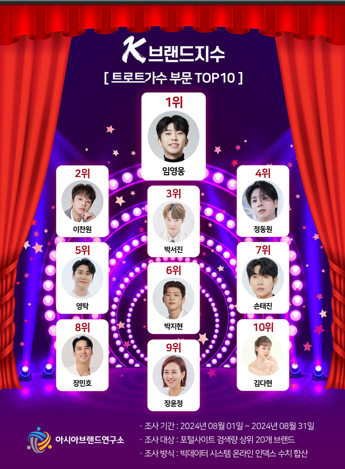 K-브랜드지수 트로트 가수 부문은 임영웅이 1위에 등극한 가운데 이찬원(2위), 박서진(3위), 정동원(4위), 영탁(5위), 박지현(6위), 손태진(7위), 장민호(8위), 장윤정(9위), 김다현(10위) 등이 TOP10의 영예를 안았다.