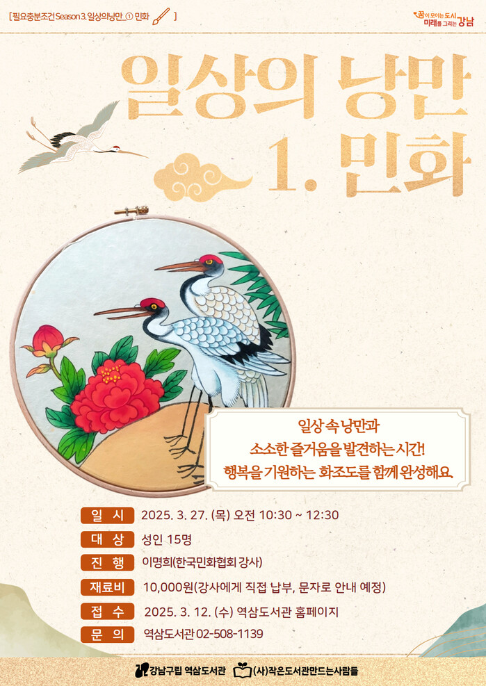 3월 강연은 한국민화협회 소속 이명희 강사가 진행하며 민화의 대표적인 종류 중 하나인 화조도를 소개하고, 민화의 기초 기법을 배우며 붓으로 작품을 완성하는 시간을 가짐으로써 오늘의 일상을 더욱 낭만적인 순간으로 물들게 할 예정이다.
