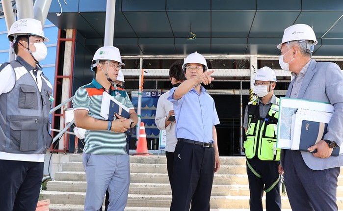 [강진=정찬남 기자] 강진원 강진군수가 지난 26일(화), 강진역 공사 현장을 찾아 여름철 폭염과 장마 속 공사 진행에 이상이 없는지 안전 점검을 가졌다.