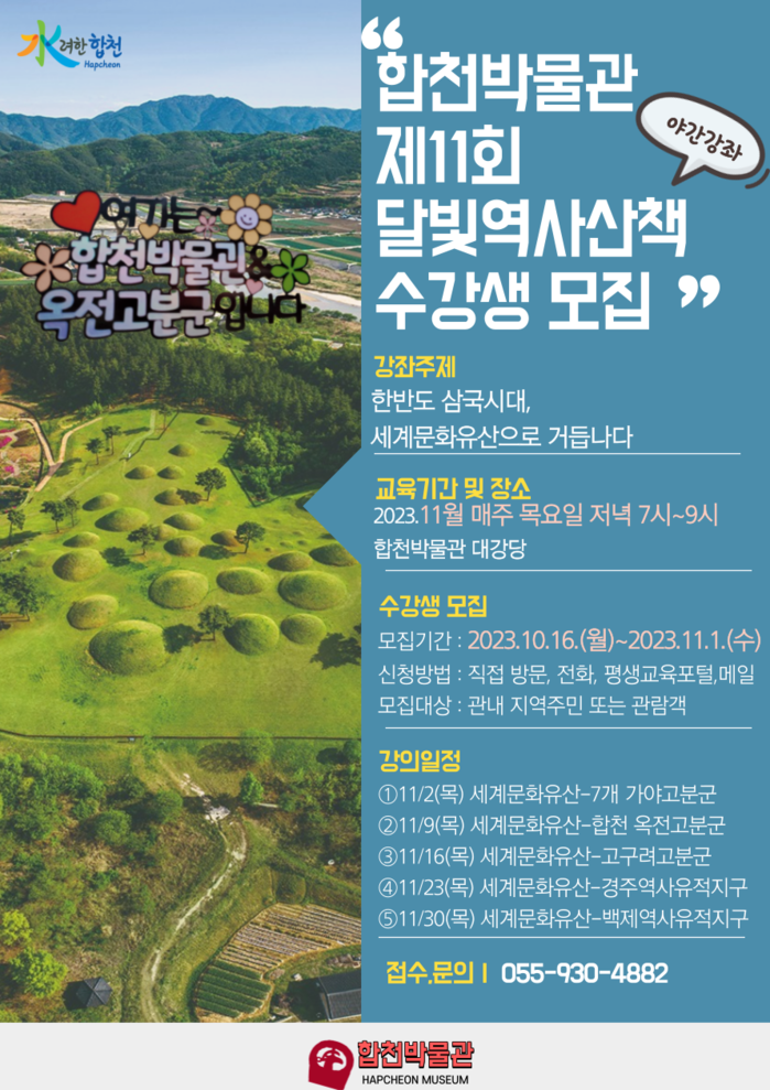 강좌는 주간에 생업 등의 활동으로 박물관을 찾지 못하는 군민들이 참여할 수 있도록 야간강좌로 진행되며 운영기간은 11월 2일부터 11월 30일까지 5주간이다. 매주 목요일 저녁 7시부터 9시까지 합천박물관 대강당에서 무료로 진행된다. 역사에 관심있는 군민과 관람객이라면 누구나 신청 가능하다.