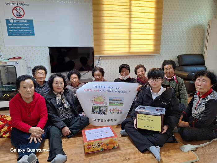[영광=장수영 기자]전남 영광염산중학교(교장 박숙진)는 지난 13일 교사와 전교생이 함께 김장 담기 체험을 진행하고, 정성껏 담근 김장김치와 함께 귤, 음료수 등을 염산면 경로당 7곳과 어려운 가정에 전달하는 연말 나눔 봉사활동을 펼쳤다.