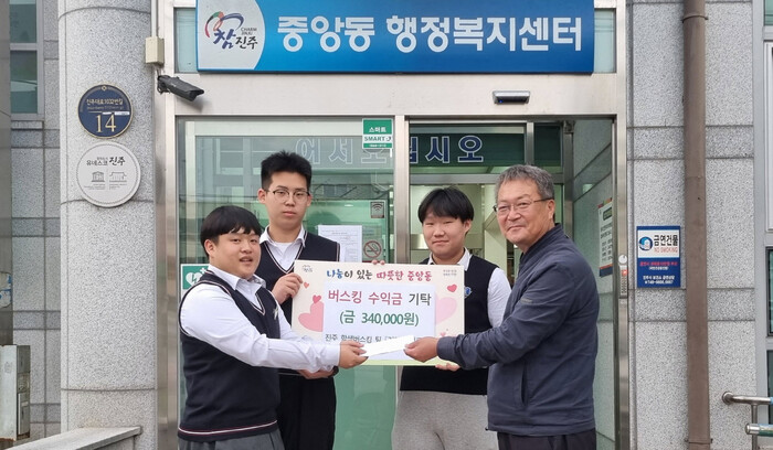 진주시 고등학생 버스킹 팀 ‘거리의 멜로디’가 25일 중앙동행정복지센터를 찾아 저소득계층을 위해 사용해달라며 공연 수익금 34만 원을 기부했다.