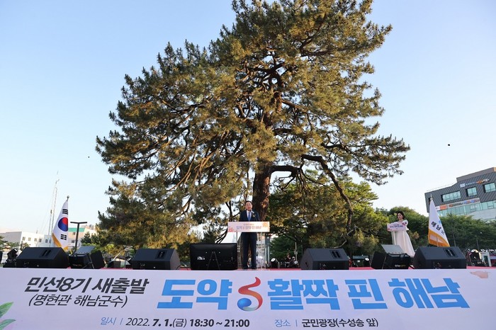 | ▲ 명현관 해남군수가 지난 1일 해남군 민선8기 출범식이 열린 군민광장에서 군민과의 약속을 공표 하고 있다. / 사진=해남군 제공 |
