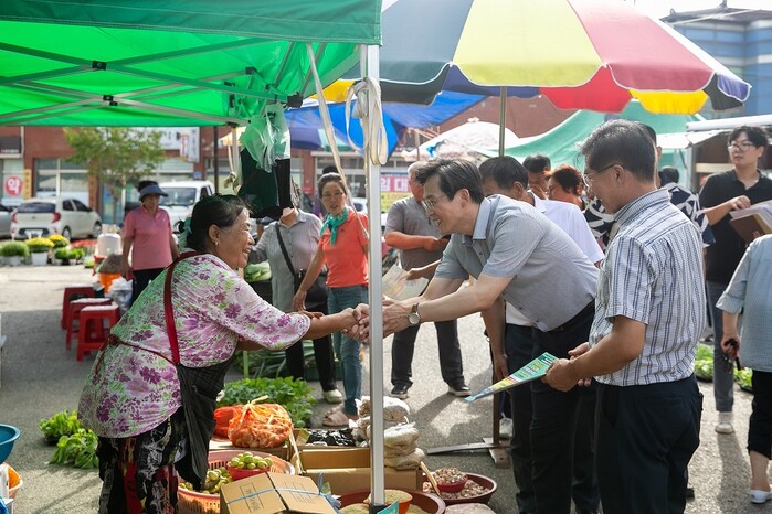 | ▲ 우승희 영암군수, 시종시장 방문 방문객들과 환담을 나누는 등 전통시장 물가 동향 점검 / 영암군 제공 |
