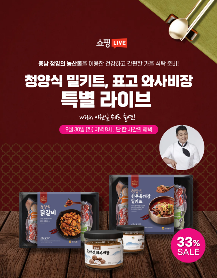 청양군 농산물 기반 밀키트 기업 그로스피크F&C(국립공주대학교 창업보육센터 입주)가 유명 셰프 이원일과 협업해 라이브커머스에 진출한다. 오는 9월 30일(화) 오후 8시 네이버 쇼핑라이브 특별 방송에서 이원일 셰프가 제품을 직접 소개하고 조리 시연을 선보일 예정이다.