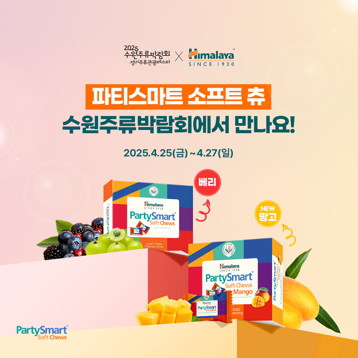 히말라야 파티스마트 소프트 츄는 4월 25일부터 27일까지 3일간 수원메쎄에서 진행되는 ‘2025 수원주류박람회 경기주류관광페스타’에 참가한다. 행사 기간 동안 방문객을 대상으로 히말라야 파티스마트 츄 2개입(믹스베리/망고 랜덤 제공)을 무료 제공할 예정이다.
