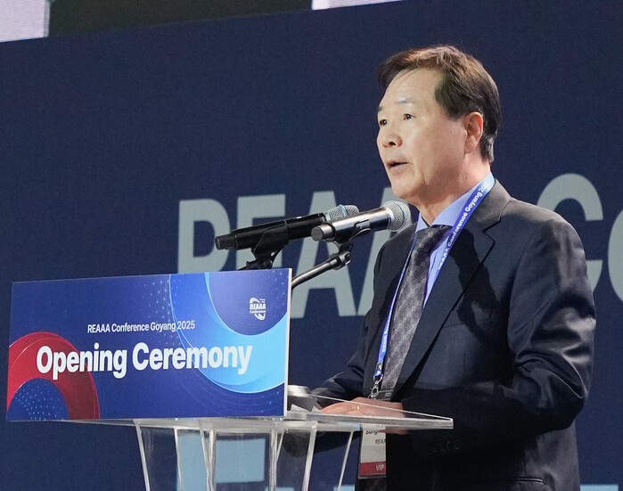 | ▲ 김성환 REAAA 회장이 '2025 고양 아시아·대양주 도로대회' 개막식에서 개회사를 겸한 개회 선언을 하고 있다. |