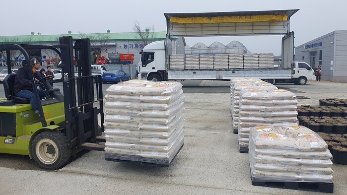 | ▲ 강진군이 올해 미호벼 생산 시범사업을 위해, 한국농업기술진흥원으로부터 미호벼 종자를 확보해 농업기술센터 내 부지에 하차작업을 하고 있다. / 강진군 제공 |