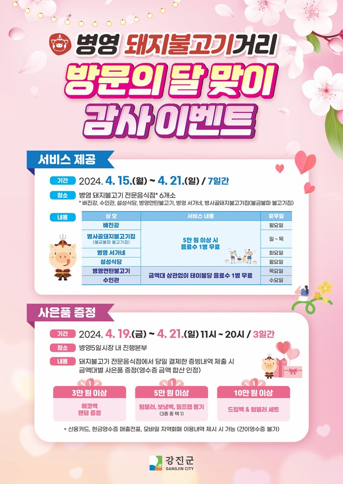 이번 행사는 병영 돼지불고기거리의 우수한 음식을 알리고, 관광객 유치로 지역경제를 활성화하고자 마련됐으며, 서비스 제공 혜택과 사은품 증정 혜택을 누릴 수 있다.