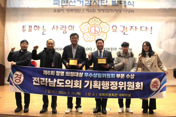 [남악=황승순 기자]전라남도의회 기획행정위원회(위원장 신민호)가 1월 11일 한국유권자중앙회가 주관하는 '정명(正ㆍ明)의정대상' 에서 ‘우수 상임위원회’로 선정됐다.