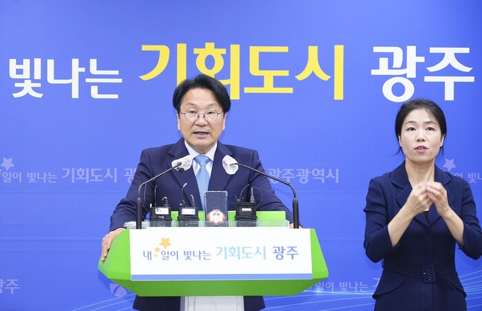 | ▲ 강기정 광주광역시장이 27일 오전 시청 브리핑룸에서 2025년도 정부예산안 반영 결과를 발표하고 있다./광주광역시 제공 |