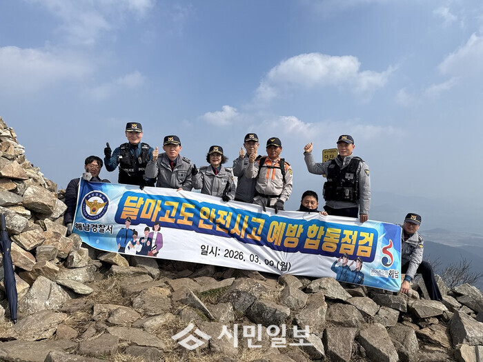 | ▲ 박미영 해남경찰서장(왼 쪽부터 네 번째)이 지난 9일 ‘2026 달마고도 힐링축제’ 등 등산객 증가 시기에 맞춰 해남군과 달마산 안전 점검을 마친 후 기념촬영을 하고 있다./ 해남경찰서 제공 |