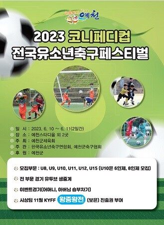 [예천=박병상 기자] 경북 예천군은 6월10일과 11일 예천스타디움과 예천진호국제양궁장에서 '2023 코니페디컵 전국유소년축구 페스티벌'을 개최한다.