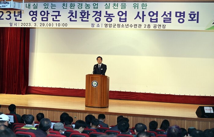 [영암=정찬남 기자] 전남 영암군(군수 우승희)은 지난 29일, 300여 명의 단지 대표들이 참석한 가운데 ‘2023년 친환경농업 사업 설명회’를 개최했다.