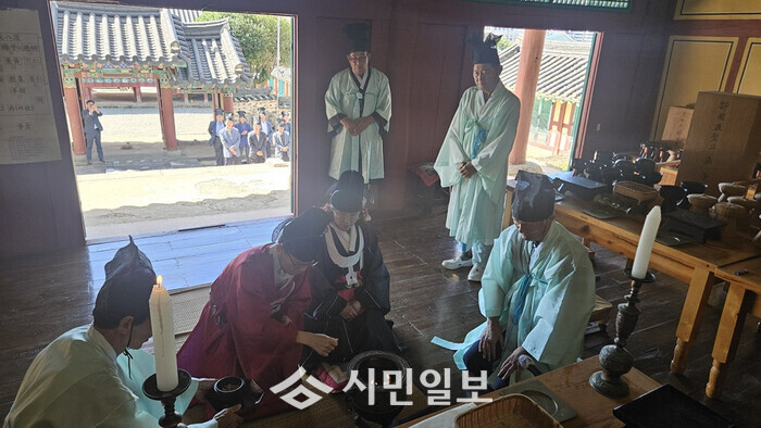 | ▲ 조연주 해남교육지원청 교육장(오른 쪽부터 두 번째 )이 22일 해남향교에서 전통문화 전승 의례인 고유례(告由禮)를 봉행하고 있다. / 해남교육지원청 제공 |