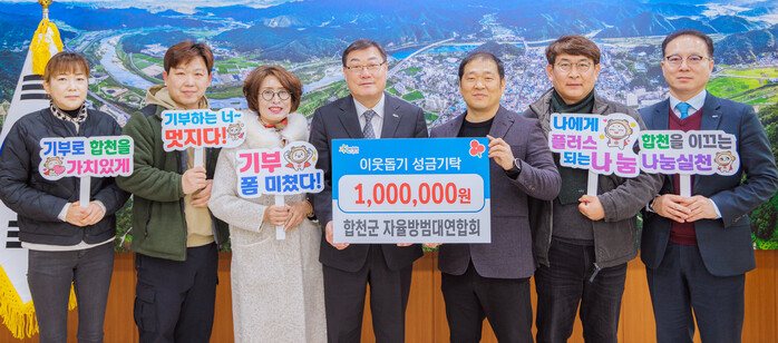 합천군 자율방범대연합대는 자율적으로 지역 방범을 수행하며 주민들의 안전을 위해 지속적으로 기여하고 있는 단체로, 2023년 농축산물가격안정기금 100만원에 이어 올해도 이웃돕기성금 100만원을 기탁하여 지역사회에 따뜻한 나눔을 전파하였다.