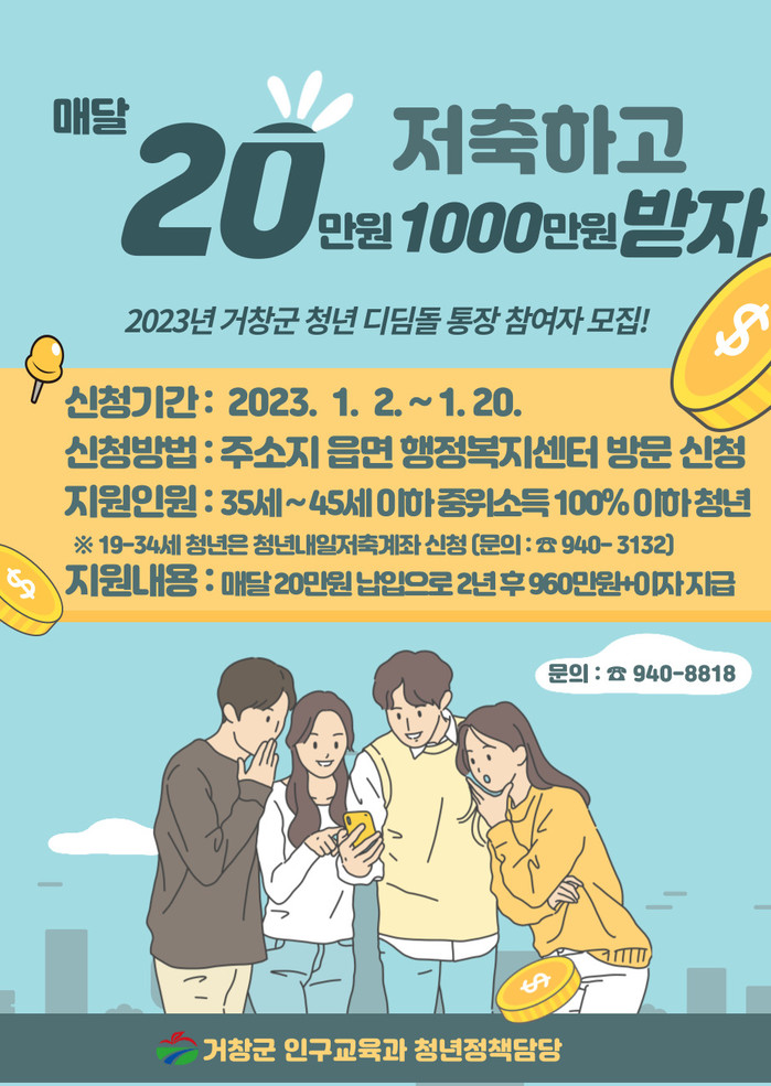 신청 자격은 35세 이상 45세 이하, 중위소득 100% 이하인 거창군에 주소를 둔 공고일 기준 2개월 이상 근로 중인 청년이어야 한다.