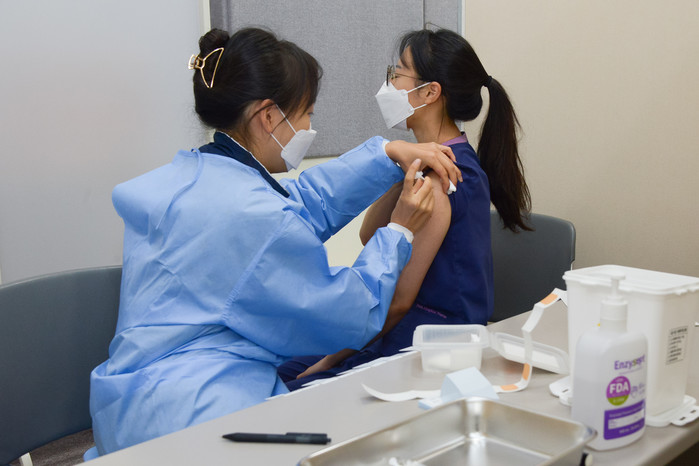 | ▲ 부산백병원 교직원이 코로나19 부스터 샷을 접종하고 있다. |