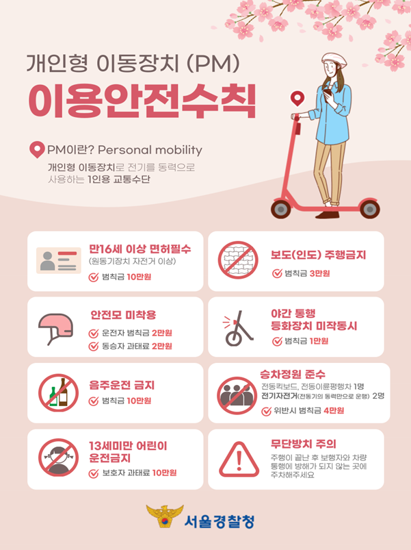 최근 서울서부경찰서는 개인형 이동장치 [PM] 관련 안전사고 및 민원 발생을 줄이기 위해 캠페인을 추진하고 있다.