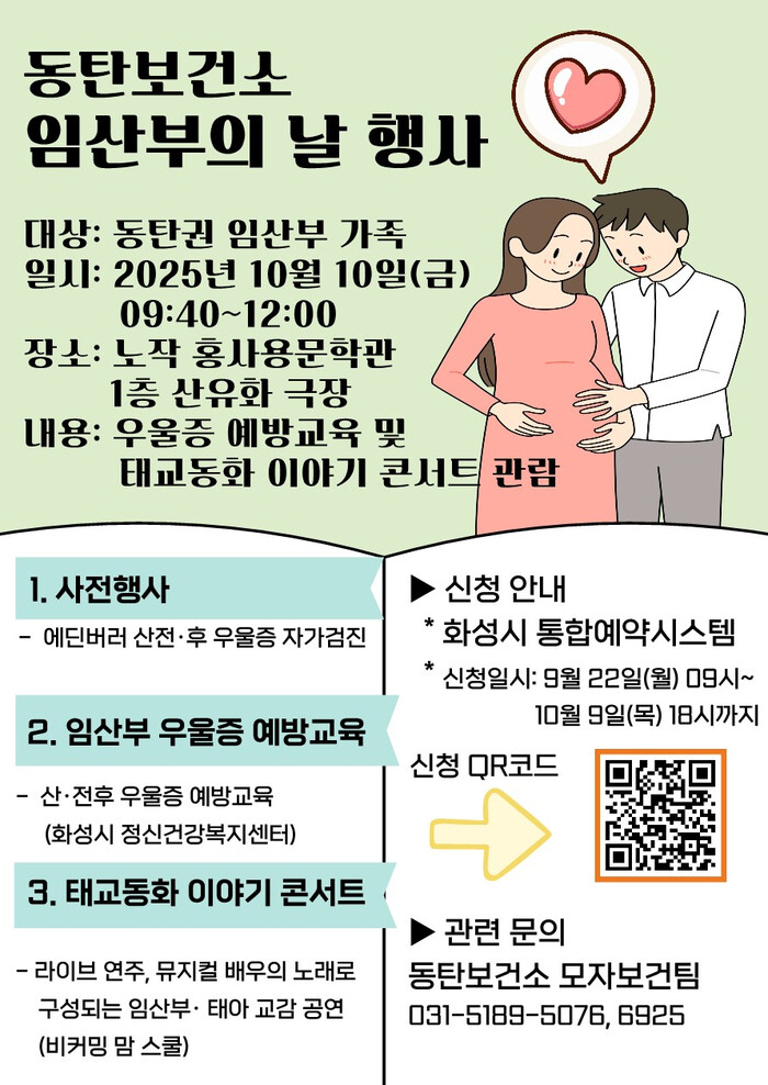 기념행사에서는 동탄권역 예비 부모 35쌍(70명)을 대상으로, ▲산전·후 우울증 예방 특강(화성시정신건강복지센터) ▲태교 동화 이야기 콘서트 등 임산부를 위한 프로그램이 운영된다.