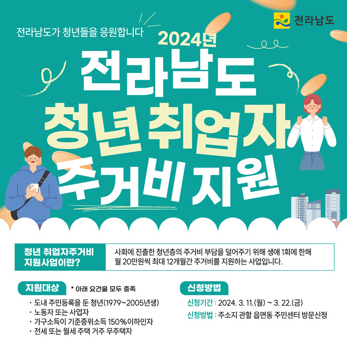 지원 대상은 무주택자로서 신청일 현재 전남에 주소를 두고 전세 5000만원 이상 또는 월세 60만원 이하의 주택을 임차해 거주 중인 일하는 청년(1979~2005년 출생자)이다.