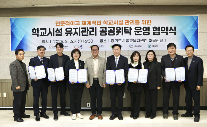 | ▲ 시흥도시공사는 시흥시 관내 초,중,고등학생에게 안전한 교육환경을 제공하기 위해 시흥시(시장 임병택), 시흥교육지원청(교육장 채열희)과 ‘학교시설 유지관리 공공위탁 운영 협약식’을 체결했다 /사진제공=시흥도시공사 |