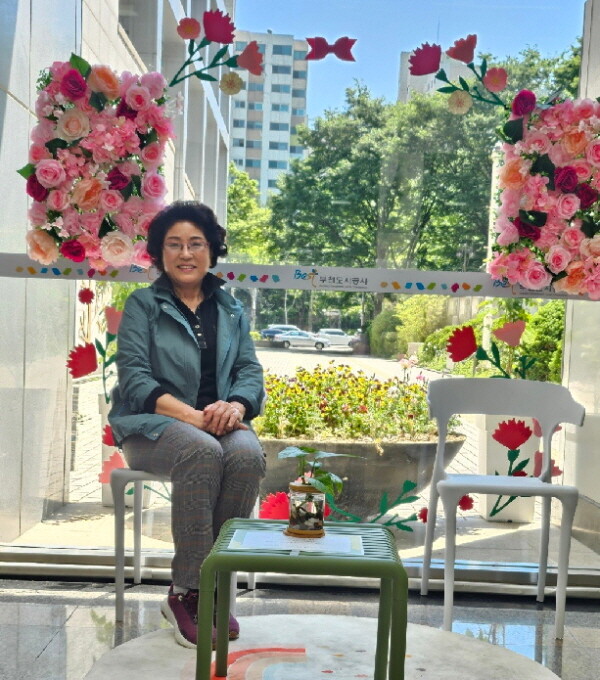| 주민이 복사골문화센터 야외 공원 카네이션 포토존에서 포즈를 취하고 있다. |