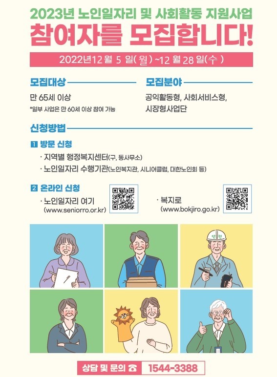 또한, 만 65세 이상 어르신이 참여할 수 있는 사회서비스형은 1142명을 선발해 보육시설 지원, 공공행정업무에 지원하고 월 60시간 활동하면 최대 71만 원까지 활동비를 받을 수 있다.