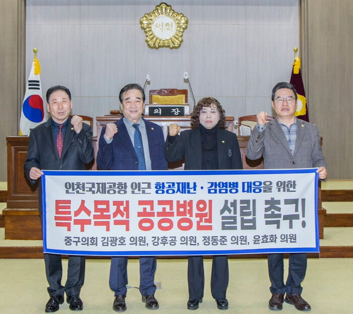 인천시 중구의회 김광호·강후공·정동준·윤효화 의원은 20일 제323회 임시회 제2차 본회의에서 성명을 발표하고 인천국제공항 인근에 항공 재난 및 감염병 대응을 위한 특수목적 공공병원 설립을 촉구했다.