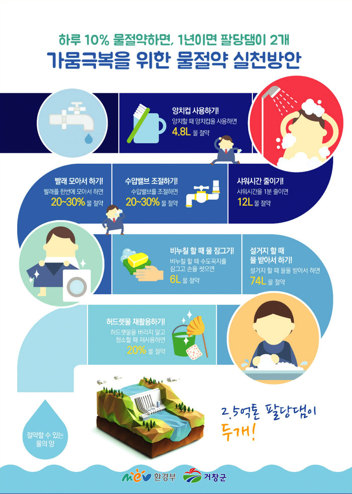 가뭄이 해소될 때까지 전광판을 비롯한 전 홍보 매체를 통해 물 아껴 쓰기 캠페인을 할 계획이며, 생활 속 절수 방법으로 ▲양치컵 사용하기 ▲샤워시간 줄이기 ▲수압밸브 조절하기 ▲빨래 모아서 하기 ▲비누칠 할 때 물 잠그기 ▲설거지 할 때 물 받아서 하기 ▲허드렛물 재활용하기 등 가정에서 가능한 실천 방법이 실린 홍보 전단지를 배부하며 주민 홍보에 매진하고 있다.