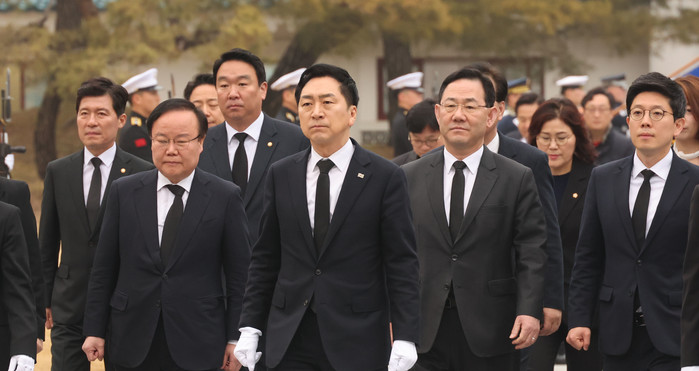 김 대표는 이날 오전 취임 첫 행보로 주호영 원내대표, 성일종 정책위의장, 김석기 사무총장 등 당 지도부와 함께 서울 동작구 현충원을 찾았다.