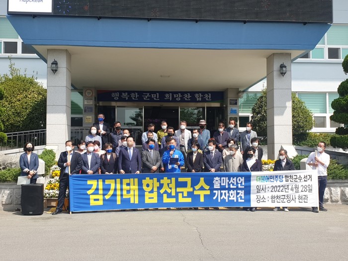 합천군 더불어민주당 김기태(61. 전 합천군 군의원, 민주평통 합천군협의회장)예비후보는 2022년 4월28일 오전 합천군청 현관 앞에서 더불어민주당 경남도당위원장 김정호 국회의원·김두관 국회의원·양문석 경남도지사후보가 참석한 가운데 기자회견을 열고 6.1 전국동시지방선거 합천군수 후보 출마를 공식 선언했다.