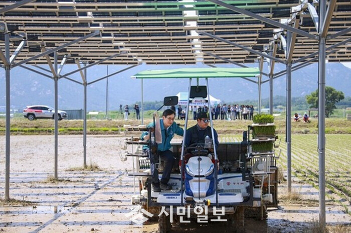 | ▲ 우승희 영암군수(왼 쪽)가 지난해 영농형태양광 실증재배단지에서 이양기에 탑승해 모내기를 하고 있다. / 영암군 제공 |