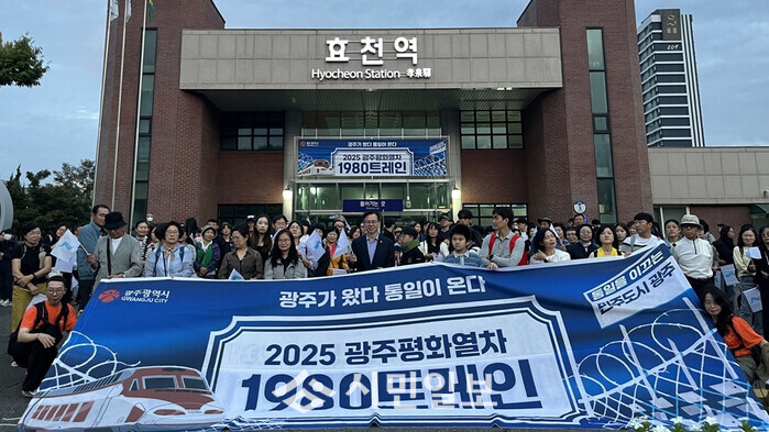 | ▲ 고광완 광주시행정부시장(사진 앞줄 가운데)이 19일 오전 남구 효천역에서 열린 '2025 광주평화열차 1980 트레인 출무식'에 참석해탑승객과 함께 기념촬영을 하고 있다. / 광주광역시 제공 |
