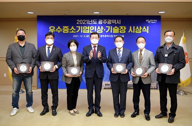 [광주=정찬남 기자] 광주광역시는 2021년 우수중소기업인 4명과 기술장 2명을 선정하고 3일 시청 비즈니스룸에서 상패를 수여했다.