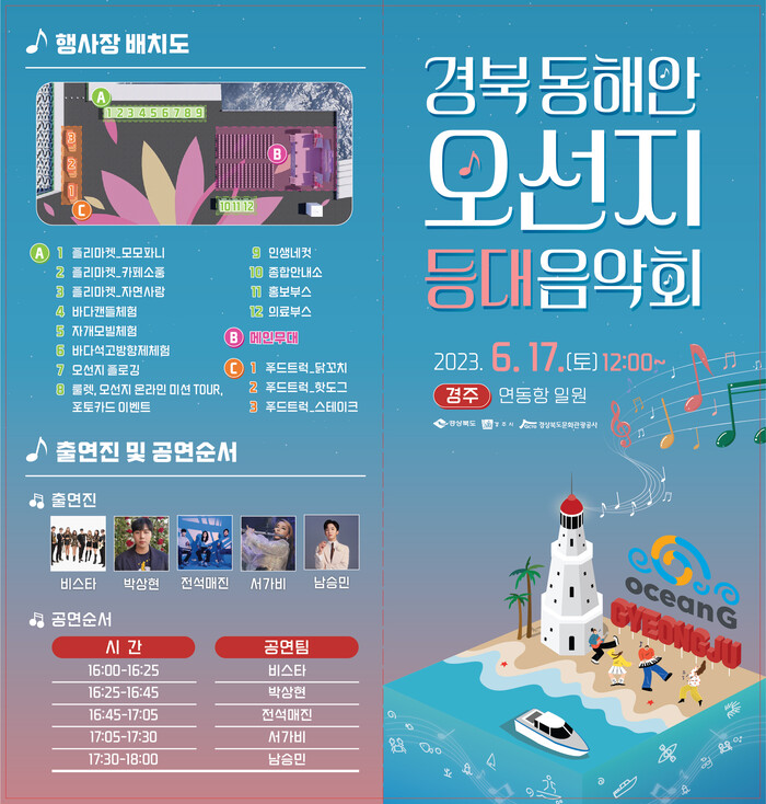 이번 동해안 등대음악회 경주편에서는 남승민(가요), 박상현(가요), 비스타(공연), 서가비(연주), 전석매진(공연)이 출연한다.