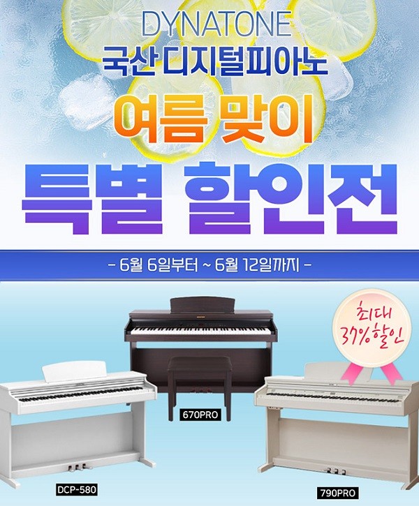 이번 여름맞이 특별 할인전 행사 모델에는 다이나톤의 플래그십 디지털피아노790PRO, 국민피아노라 불리는 DCP-580을 포함하여 3종으로 진행된다.