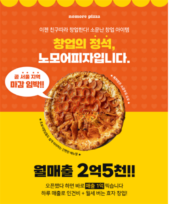 노모어피자 관계자는 “본사와 가맹점의 상생경영 원칙에 기반해 소자본 창업부터 교육, 운영까지 체계적인 맞춤형 창업 지원 시스템을 제공하고 있다”며 “상권 분석을 통한 마케팅 활동과 맞춤형 메뉴 지원, 교육 지원 등을 통해 초기 안정적인 시장 진입 및 매장 운영을 적극적으로 돕고 있다”고 전했다.