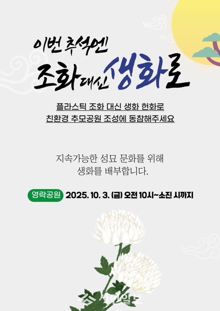 정미경 자원순환과장은 “지속 가능한 성묘 문화를 위해서는 작은 실천이 중요하다”며 “플라스틱 조화 대신 생화를 사용해 친환경 추모공원 조성에 함께해 주길 바란다”고 당부했다.